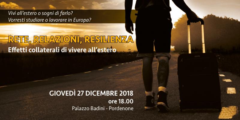 PORDENONE – “Rete, relazioni, resilienza. Effetti collaterali di vivere all’estero”: questo il tema dell’incontro dedicato a chi vive all’estero o sogna di farlo, a chi vorrebbe studiare o lavorare in Europa. Giovedì 27 dicembre alle 18 a Palazzo Badini a Pordenone, corregionali d’Europa, eccellenze pordenonesi e studenti si confronteranno con esperti di settori apparentemente lontani: It, relazioni e comunicazione strategica. Come gestire con successo le chiavi della fatica e della lontananza? Lo spiegheranno Sergio Maistrello, giornalista e consulente in ambito comunicazione, innovazione e rete, assieme a Matteo Rampin, medico psicoterapeuta esperto di problem solving non convenzionale, consulente di manager, atleti e artisti. L’incontro sarà moderato da Gian Mario Villalta, direttore artistico di pordenonelegge. A conclusione del 2018, questa iniziativa offrirà l’occasione per un consuntivo dei progetti avviati sul tema, nei mesi scorsi, da EFASCE - Ente Friulano Assistenza Sociale e Culturale Emigranti – Pordenonesi nel mondo, con la Fondazione pordenonelegge.it attraverso il sostegno della Regione autonoma Friuli Venezia Giulia.