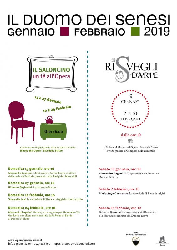 Dopo il successo di pubblico delle passate edizioni, l’Opera della Metropolitana ripropone anche per il 2019, “Il Duomo dei Senesi”, il cartellone di eventi culturali invernali, fortemente voluti dal Rettore Gian Franco Indrizzi. L’Opera della Duomo intende così offrire ai cittadini momenti di approfondimento storico-artistico fatti di incontri, visite guidate e conferenze, su temi che gravitano attorno al magnifico complesso monumentale della Cattedrale, in un periodo dell’anno in cui la minor affluenza turistica ne garantisce una più tranquilla ed emotivamente coinvolgente partecipazione. Il ‘Duomo dei senesi’ si divide in due proposte Il Saloncino, un tè all’Opera e Risvegli d’Arte. Il Saloncino, appuntamento della domenica, evoca lo spazio teatrale anticamente situato di fianco al Duomo, nel Museo dell’Opera, ove furono recitate le tragedie di Vittorio Alfieri, il drammaturgo e poeta che ebbe con Siena un legame privilegiato, a partire dal 1766, quando pur soggiornandovi soltanto per un solo giorno, fu subito colpito dal modo gentile della parlata. Al di là dei riferimenti teatrali, il “Saloncino” ricorda i “salotti” che in Siena l’Alfieri amò frequentare stringendo legami di amicizia e istituendo rapporti intellettuali con le persone colte della città. Durante il pomeriggio, al termine della conferenza, degustazione di tè pregiati provenienti da tutto il mondo. Risvegli d’arte, appuntamento del sabato, vuole invece trattare i diversi argomenti muovendosi tra le bellezze del complesso monumentale. Dopo una colazione di benvenuto infatti i partecipanti verranno guidati dai diversi relatori in un percorso tematico potendo vivere con esperienza diretta i contenuti delle varie conferenze.