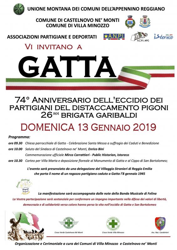 CASTELNOVO MONTI – L'unione dei Comuni dell'Appennino, il Comune di Castelnovo Monti e il Comune di Villa Minozzo, insieme alle associazioni Partigiane e dei Deportati Anpi, Alpi Apc, Istoreco, hanno organizzato a Gatta domenica, 13 gennaio, le commemorazioni per il 74° anniversario dell'eccidio dei Partigiani del Distaccamento Pigoni, 26^ Brigata Garibaldi.