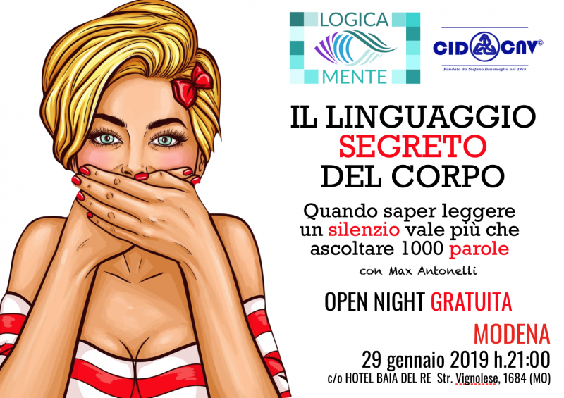 Per questo motivo si dice che la verità si nasconde proprio nel silenzio del linguaggio più parlato al mondo: quello non verbale.In un affascinante e misterioso viaggio alla scoperta dell’emotività e delle sue espressioni, Logica|Mente e Cid-CNV presentano un evento gratuito e aperto a tutti che vedrà la partecipazione di un conduttore d’eccezione, Max Antonelli, in programma per il 29 Gennaio 2019 a Modena alle ore 21:00: un meetup dal titolo “Il Linguaggio Segreto del Corpo“.