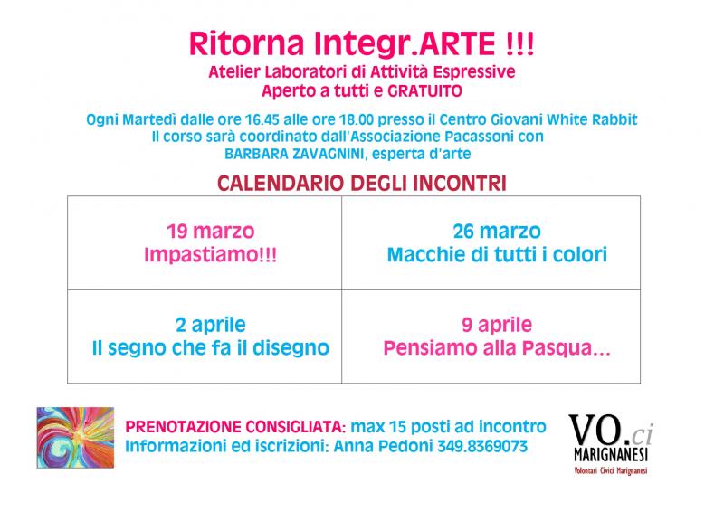 INTEGR.ARTE è stato ideato dall’Associazione Davide Pacassoni, la realtà marignanese operante da 25 anni sul territorio, con bambini e ragazzi diversamente abili. La referente, Anna Pedoni, in collaborazione con Barbara Zavagnini, volontaria esperta in attività espressive, apre le porte da ben 4 anni a tutti i bambini e ragazzi che desiderino di condividere incontri e ritrovarsi nell’esperienza creativa e nella produzione laboratoriale. L’Amministrazione concede a titolo gratuito gli spazi del centro giovani grazie alla collaborazione con l’Associazione Alternoteca che gestisce lo spazio Centro Giovani White Rabbit.