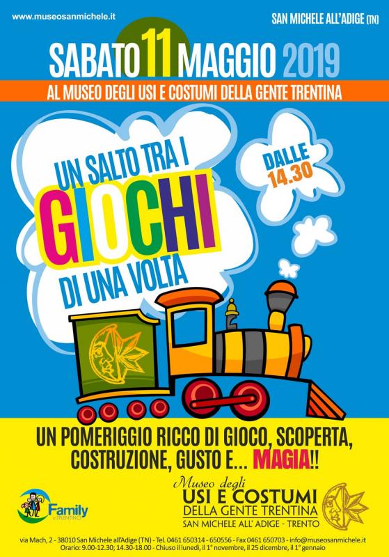 Per l’ottavo anno consecutivo i Servizi educativi del Museo degli Usi e Costumi della Gente Trentina propongono “Un salto… tra i giochi di una volta”.Nell’era del computer, dei videogiochi 3d, del digitale terrestre, il Museo ripropone i giochi in cui si cimentavano i nonni e i bisnonni, valorizzando attività ludiche povere nei materiali ma ricche nello sviluppare le abilità di base quali la coordinazione, l’agilità, la logica e l’inventiva, che permettevano la socializzazione nelle corti o nelle piazze dei paesi.Durante il pomeriggio di sabato 11 maggio, a partire dalle ore 14.30, i bambini hanno la possibilità di conoscere da vicino alcuni giocattoli di una volta e provare in prima persona i giochi che i loro nonni facevano un tempo all’aria aperta.Il programma prevede numerosi giochi in cui cimentarsi, come i trampoli, il tiro al bersaglio, la gara dei tappi, il flipper, il tiro ai “cioni”… Ma anche un laboratorio di falegnameria per costruire un simpatico giocattolo in legno, un angolo con i primi giochi in plastica degli anni ’60, dei giochi sensoriali per mettere alla prova i cinque sensi, uno spazio riservato ai più piccoli con cavalli a dondolo e altri giochi. Inoltre tutti possono assaporare una dolce nuvola di zucchero filato.