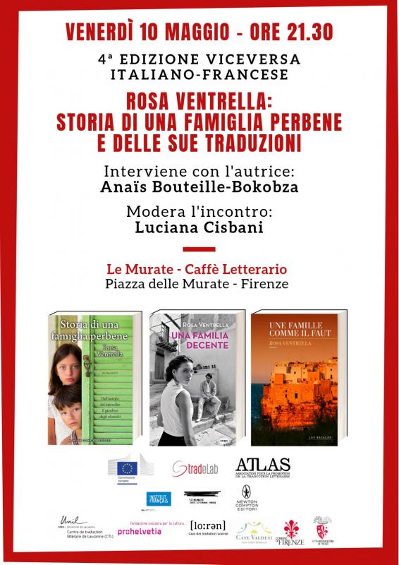 L’evento proseguirà poi alle 21.30 presso il Caffè Letterario Le Murate (piazza delle Murate), dove Rosa Ventrella parlerà del suo romanzo “Storia di una famiglia perbene”, diventato un vero e proprio caso letterario (prima ancora di arrivare nelle librerie italiane, i diritti sono stati venuti in 17 Paesi). Romanzo familiare ambientato in un rione povero e violento di Bari vecchia, negli anni Ottanta, parla di Maria, che cresce insieme ai due fratelli più grandi. Maria è una bambina indipendente e volitiva, un po' selvaggia, e per questo è soprannominata Malacarne. L'unico punto fermo nella sua vita è Michele, figlio della famiglia più disgraziata di Bari vecchia. L'amicizia tra i due si trasformerà, negli anni, in un amore che li preserva dal rancore verso il resto del mondo e dalla decadenza che li circonda. L'incontro sarà moderato da Luciana Cisbani, traduttrice e conduttrice con Dominique Vittoz del ViceVersa italiano-francese.