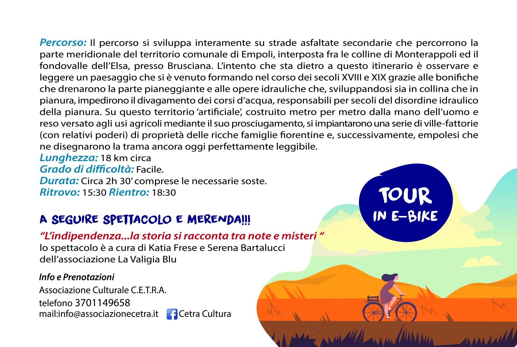 La campagna empolese farà da sfondo a questa iniziativa gratuita in occasione delle celebrazioni per l'Indipendenza della Toscana; un percorso ad anello con partenza e ritorno presso la Fattoria didattica di Penelope a Brusciana in compagnia della guida ambientale Paolo Gennai, che illustrerà tutte le potenzialità del paesaggio rurale dell'Empolese Valdelsa e delle infrastrutture che lo caratterizzano, con particolare riferimento proprio alle fattorie.