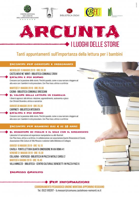 CASTELNOVO MONTI – L'Unione dei Comuni dell'Appennino, in collaborazione con le biblioteche di Castelnovo Monti, Casina e Carpineti, propone una serie di appuntamenti sull'importanza della lettura per i bambini dal titolo “Arcunta. I luoghi delle storie”. Una iniziativa che prosegue il progetto avviato negli anni passati con la finalità di promuovere negli adulti la consapevolezza dell’importanza della lettura e della narrazione delle storie fin da piccoli, e vuole offrire occasioni ai bambini di ascolto e attività legate agli albi illustrati.