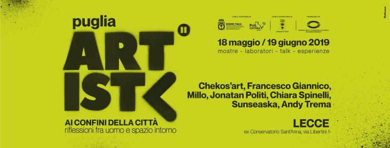 Dal 18 maggio al 19 giugno a Lecce, tra l'Ex Conservatorio Sant'Anna e il quartiere San Pio, la seconda edizione di PugliArtist propone un ricco programma di incontri, mostre, laboratori per bambini e bambine, la realizzazione di un ritratto murale dedicato a Edoardo De Candia per indagare le periferie, spesso trascurate e abbandonate, ma che rappresentano una fucina di creatività e socialità in continuo fermento. Tra gli ospiti del progetto - promosso dall'Agenzia per il Patrimonio Culturale Euromediterraneo di Lecce, a cura dell'artista Emilia Ruggiero con la consulenza di Lorenzo Madaro, realizzato in collaborazione con numerosi partner e cofinanziato dal programma straordinario 2018 in materia di cultura e spettacolo della Regione Puglia - gli artisti Millo, Chekos’Art, Andy Trema, Sunseaska, Chiara Spinelli, Jonatan Politi. Sabato 18 maggio da Parco Corvaglia parte il primo laboratorio per i più piccoli con Francesco Giannico.