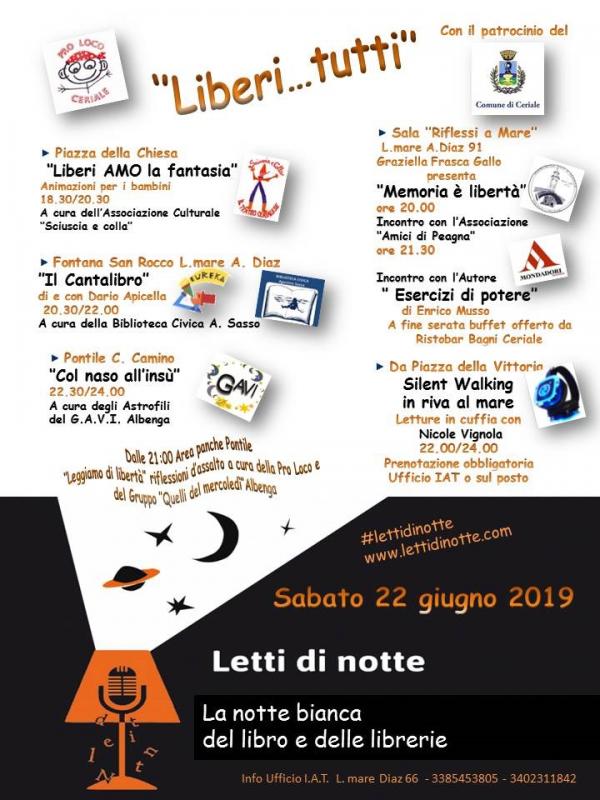 Tema dell’edizione di quest’anno è ‘Libertà Patrocinata dal Comune, la nostra Letti di notte è frutto di una riuscita collaborazione tra la Pro Loco, la Biblioteca Civica A.Sasso, l’associazione culturale Sciuscia e colla, l’associazione Amici di Peagna, il GAVI, Gruppo Astrofili Volontari Ingauni, Mondadori Bookstore Loano, il Gruppo teatrale Quelli del mercoledì e l’attrice Nicole Vignola.