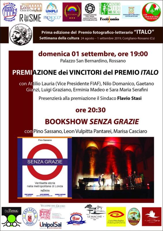 Domenica 1 settembre, ore 20,30, nel Palazzo san Bernardino di Rossano (CS), il Bookshow del libro di Pino Sassano, “Senza grazie”, Infinito ed., chiuderà la prima edizione del Premio Fotografico-Letterario “ITALO".
