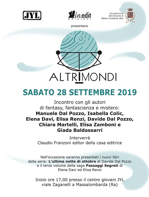 Sabato 28 settembre al centro giovani Jyl di Massa Lombarda arrivano “Altrimondi”, incontri con gli autori di fantascienza, fantasy e mistero. Dalle 17 dialogheranno col pubblico Manuele Dal Pozzo, Isabella Colic, Elena Davi, Elisa Renzi, Davide Dal Pozzo, Chiara Martelli, Elisa Zamboni e Giada Baldassarri.