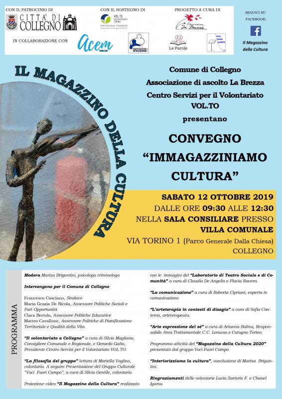 Atto conclusivo del percorso progettuale “Il Magazzino della Cultura” ideato dall’Associazione di ascolto La Brezza Onlus ed a presentazione del programma di incontri previsti a partire da gennaio 2020 e aperti a tutta la cittadinanza, nella mattinata di sabato 12 ottobre dalle h 9,30 nella Sala Consiliare presso Villa Comunale di Via Torino 9 del Comune di Collegno si terrà il convegno “Immagazziniamo cultura”, con la presenza degli Enti e Associazioni che hanno collaborato alla realizzazione del progetto.