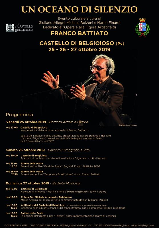 Nei giorni 25-26-27 ottobre 2019 si terrà nel castello di Belgioioso (Pv), un evento culturale a cura di Giuliano Allegri, Michele Bolzoni e Marco Finardi, dedicato alla Figura Artistica di FRANCO BATTIATO