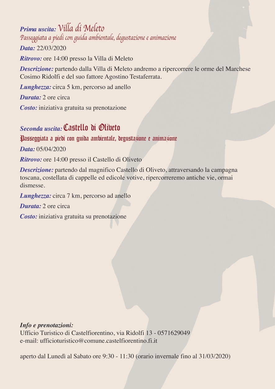 In occasione della "Festa della Toscana 2019" il Comune di Castelfiorentino, in collaborazione con Associazione culturale C.E.T.R.A., propone due pomeriggi in compagnia di una guida ambientale professionale che condurrà i partecipanti alla scoperta dei luoghi che abbracciano la Villa di Meleto ed il Castello di Oliveto, ripercorrendo le orme di Cosimo Ridolfi e Agostino Testaferrata oppure muovendosi lungo le vie oggi dimenticate, costellate di cappelle ed edicole votive.