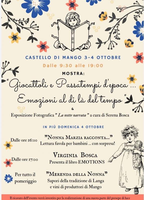 Il castello di Mango ospita, nel prossimo fine settimana, la bella mostra “Giocattoli e passatempi d’epoca”: un tuffo nei ricordi e nelle emozioni di un tempo a partire dal primo ‘900 fino agli anni ’60, ed anche l’esposizione fotografica “La notte narrata” curata da Serena Bosca.