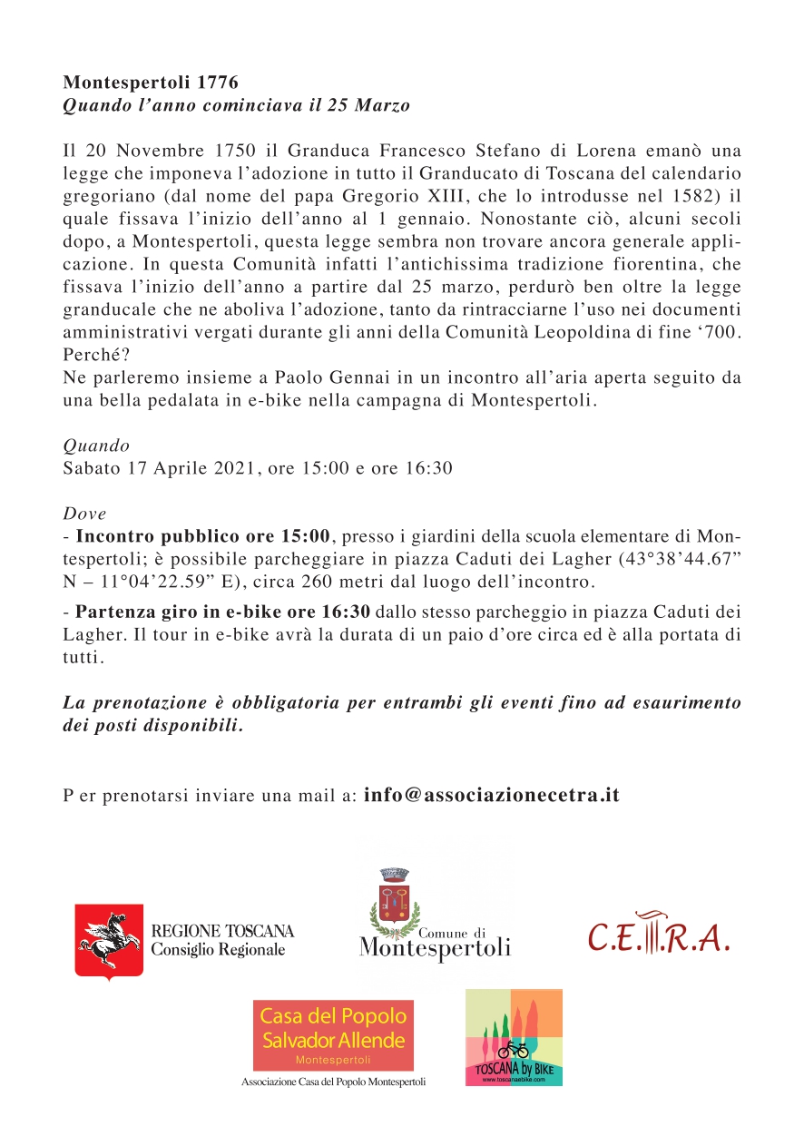Lo storico Paolo Gennai illustrerà i particolari che caratterizzarono questa scelta in un incontro pubblico all'aperto; a seguire un percorso in e-bike nella campagna di Montespertoli, accompagnati dal team di Toscana by Bike.