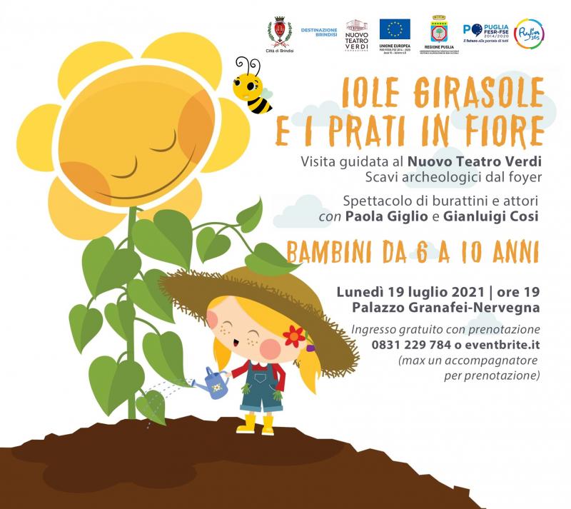 Ancora un appuntamento «Visioni», la rassegna di visite guidate e performative dedicata all’arte e alla storia di Brindisi: i bambini tornano protagonisti lunedì 19 luglio con la visita guidata agli Scavi archeologici di San Pietro degli Schiavoni da una speciale prospettiva, quella del foyer del Nuovo Teatro Verdi di Brindisi, dove è collocato un grande pavimento di cristallo che sovrasta il sito archeologico. Terminata la visita, i bambini faranno un giro nella fantasia con lo spettacolo di performer e burattini «Iole Giorasole e i prati in fiore», con Paola Giglio e Gianluigi Cosi. Partenza dall’Infopoint di Palazzo Granafei-Nervegna alle ore 19: la partecipazione è gratuita con prenotazione al T. 0831 229 784 oppure sulla pagina di Eventbrite.it https://bit.ly/3jemQ79.