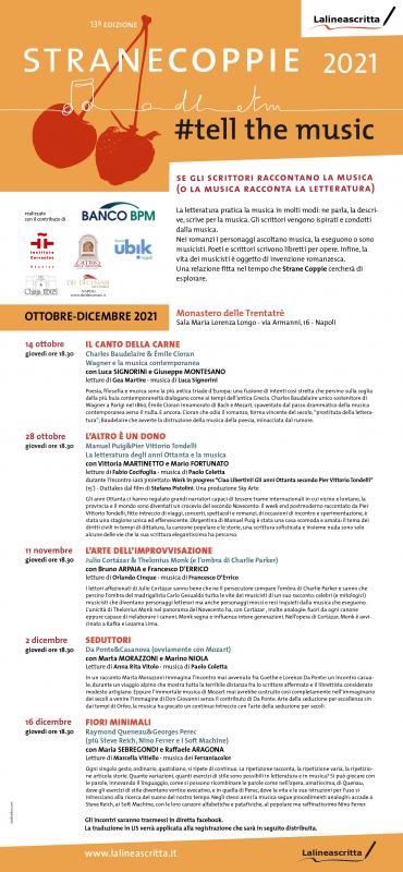Con cinque appuntamenti dal 14 ottobre al 16 dicembre la tredicesima edizione della rassegna di letteratura internazionale Strane coppie, intitolata Tell the music ideata e condotta dalla scrittrice Antonella Cilento, indagherà il fitto rapporto intrecciato in diverse epoche tra stili e linguaggi della letteratura, della poesia e della musica.