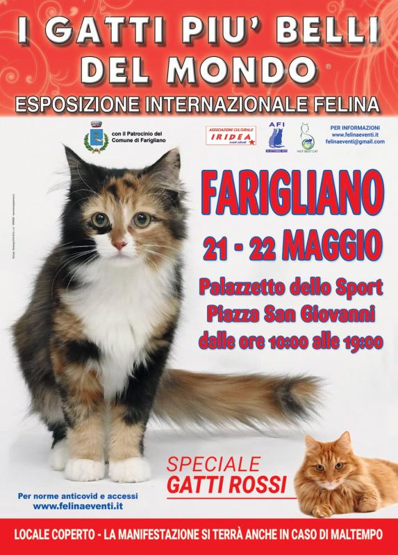 Per la prima volta a FARIGLIANO nei giorni di sabato 21 e domenica 22 Maggio presso il Palazzetto dello Sport in Piazza San Giovanni, con orario dalle ore 10 alle ore 19, si svolgerà l'Esposizione Internazionale Felina "I GATTI PIU' BELLI DEL MONDO" con la partecipazione di tanti di gatti di razza che, sotto l'egida dell'Associazione Felina Italiana (A.F.I.) verranno giudicati da Giudici Internazionali WCF (World Cats Federation) nel Best in Show in programma al pomeriggio di entrambe le giornate.