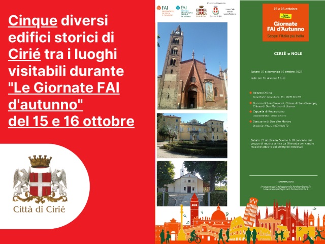 Ci saranno anche cinque edifici storici di Cirié tra i luoghi visitabili per "Le Giornate FAI d'autunno", l'evento di piazza che il FAI- Fondo per l'Ambiente Italiano ETS dedica ogni anno in autunno al patrimonio culturale e paesaggistico del nostro Paese, animato e promosso dai vari Gruppi FAI e in collaborazione con le Amministrazioni e i direttivi dei Comuni e dei beni coinvolti.
