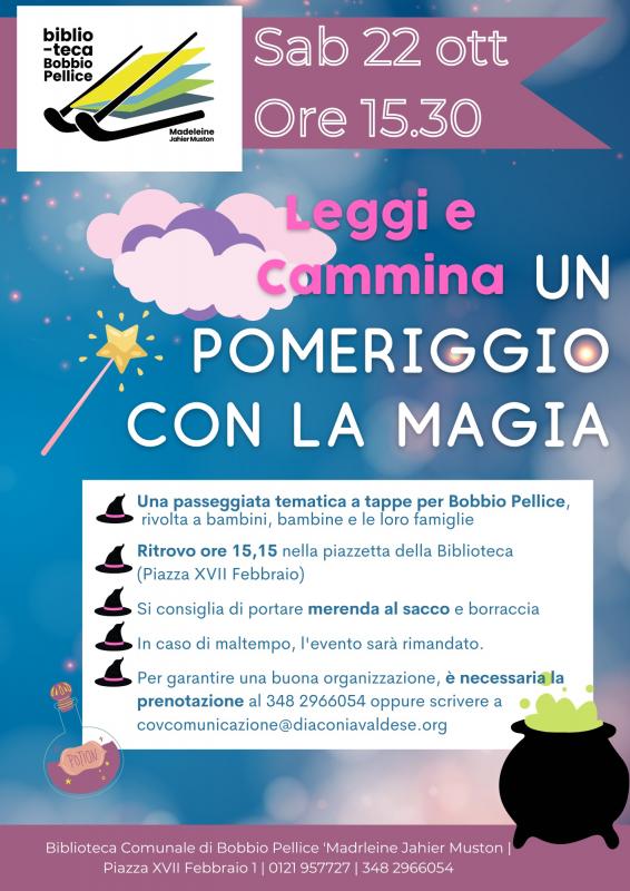 La Biblioteca Comunale di Bobbio Pellice (TO), insieme al Servizio Giovani e Territorio della Diaconia Valdese Valli, organizza nel pomeriggio di sabato 22 ottobre una Leggi e Cammina per le vie di Bobbio Pellice (TO) rivolta a bimbi, bimbe e le loro famiglie.
