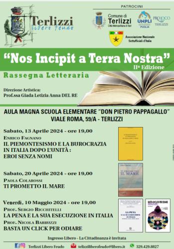 La rassegna Letteraria “Nos Incipit a Terra Nostra”, promossa dall’APS “Terlizzi Libero Feudo” e presieduta dalla Prof.ssa Giada Letizia Anna DEL RE, ritorna con la sua seconda edizione che quest’ano si svilupperà in tre serate il 13 e 20 aprile e 10 maggio, presso l’aula magna del 1 C.D. “Don P. Pappagallo” in Terlizzi.