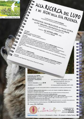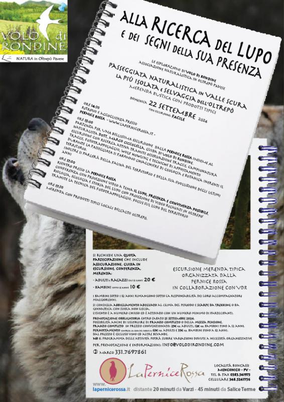 DETTAGLIO• Ore 14:30 ritrovo e accoglienza presso PERNICE ROSSA - www.lapernicerossa.it• ore 15:00 partenza per UNA BELLISSIMA escursione dalla PERNICE ROSSA INSIEME al naturalista dott. Marco Ciccolella, guida di Volo di Rondine. escursione con ricerca attiva tramite osservazione tracce, campionatura tracce, fototrappolaggio, Wolf howling e tecniche di appostamento DURANTE LA PASSEGGIATA SI FARANNO chiacchiere di geologia e botanica inerenti il territorio. Inoltre si parlerà della fauna del territorio e della sua evoluzione degli ultimi anni• ore 17:00 rientro presso la PERNICE ROSSA conferenza con proiezione video a tema “il lupo, presenza e convivenza possibile”. Biologia, ecologia e storia del lupo con proiezione di video ricavati in Oltrepo' tramite la tecnica del fototrappolaggio.• ore 17:30 Merenda con Prodotti tipici locali dell'alto Oltrepò.