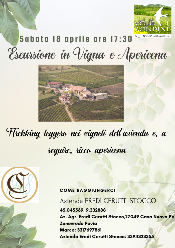 Programma- ore 17:30 ritrovo presso l'azienda Agricola Eredi Cerutti Stocco, registazione, e inizio escursione accompagnati dal naturalista dott. Marco Ciccolella, guida di Volo di Rondine. Durante la passeggiata, in notturna, ci si dedicherà all'osservazione di flora, tracce di fauna sia nelle vigne che in un particolare ambiente selvatico con presenza di uno stagno.Il tutto nel silenzio della sera cercando di percepire la presenza dei selvatici molto attivi negli orari crepuscolari.Proprio in questo ambiente verranno fornite le basi per entrare nel mondo del "fototrappolaggio naturalistico".Rientrati in Azienda, proietteremo i risultati video del 2025 ottenuti tramite la tecnica del fototrappolaggio, ricavati dagli studi in Oltrepò Pavese, si parlerà di fauna selvatica e di impatto sul territorio.A seguire, saranno organizzati tavoli dedicati per nucleo famigliare e verrà servito un ricco apericena.Sarà l'occasione per assaggiare anche i vini prodotti dalla stessa azienda Eredi Cerutti Stocco.Termine intorno alle ore 21:00N.B.: l'attività è aperta a tutti, ed è per un NUMERO MOLTO LIMITATO di partecipanti;La quota comprende l'assicurazione, la partecipazione alla escursione guidata e apericena al rientro in Azienda.Minori rimangono sotto la responsabilità dei propri accompagnatori.Cani ammessiCosto partecipazione: 20 euro adulti10 euro bambini sotto gli 8 anni