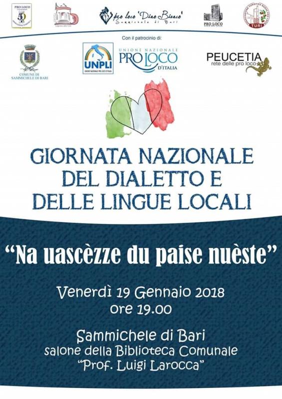 Vi invitiamo venerdí 19 gennaio alle 19 presso il Salone della Biblioteca Comunale di Sammichele di Bari per celebrare le Giornata Nazionale del Dialetto in un pre-serata scoppiettante all'insegna del dialetto, con poesie, stornelli, esibizioni teatrali e molto altro.
