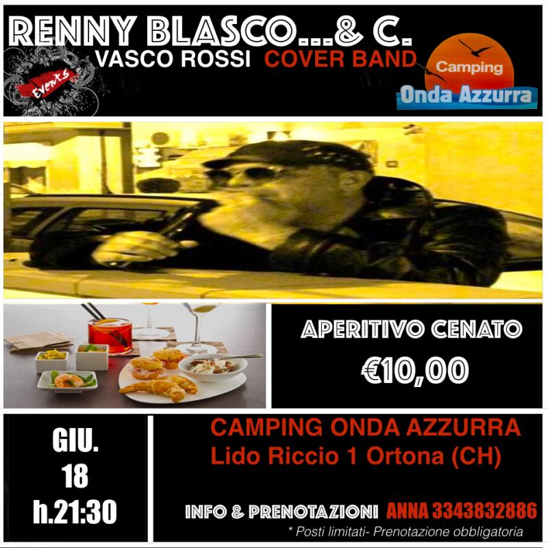 Serata all'insegna del divertimento con le canzoni di Vasco Rossi cantate dal mitico Renny Blasco e dell'aperitivo cenato offerto a soli 10,00€ dal Camping Onda Azzurra. Fa da contorno la magica atmosfera tra natura e mare offerta dal Camping Onda Azzurra.L'aperitivo comprende: Tavolo riservato con bevanda o cocktail e stuzzichini vari,ecc.Prenotazione tavoli obbligatoria a posti limitati.