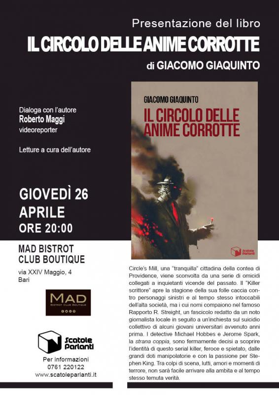 Il circolo delle anime corrotte, un thriller mozzafiato "che vi terrà incollati fino all'ultima pagina", dichiara l'autore Giacomo Giaquinto. "Il romanzo è ambientato nella fittizia cittadina di Circle's Mill dove ogni anno il periodo invernale coincide con la vendita dei migliori bigliettini di auguri, fabbricati da autentici maestri del settore. Tra le tranquille stradine della contea, un serial killer inizia a manipolare la mente di alcuni pezzi grossi spingendoli al suicidio. Le vittime, all'apparenza intoccabili, covano un grande e tremendo segreto redatto in un'inchiesta giornalistica chiamata "Rapporto R. Streight", immediatamente insabbiata dalla corruzione della città. I detective Michael Hobbes e Jerome Spark dovranno lottare contro l'omertà, i segreti, le menzogne e un abile predatore per raggiungere la tanto agognata verità.Voi sareste disposti a difendere un orrendo segreto se ci fosse in ballo la vostra vita? Scopritelo giovedì 26 aprile alle ore 20.00 al MAD BISTROT CLUB BOUTIQUE tramite le letture a cura dell’autore e il dialogo con il Videoreporter Roberto Maggi.