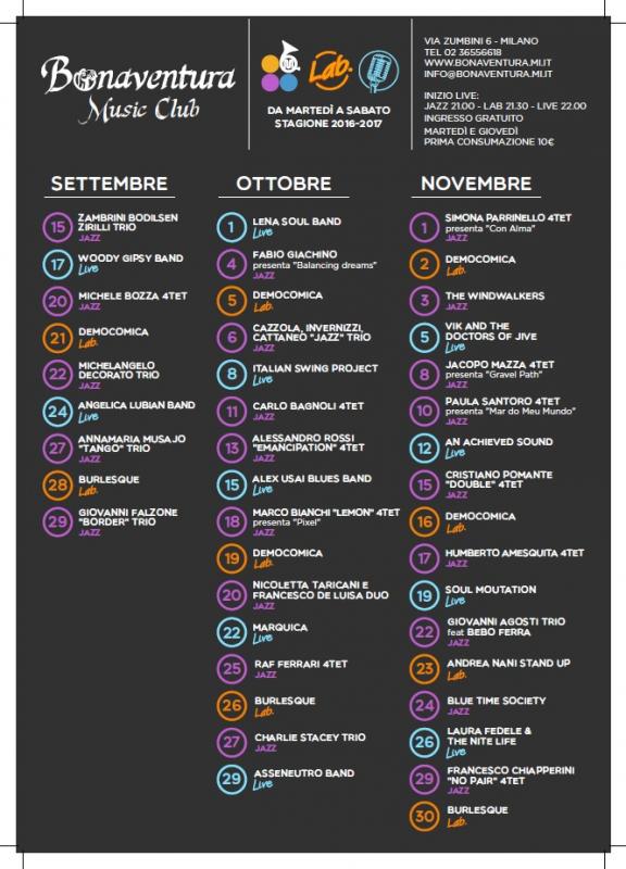 Come nelle passate stagioni, anche nei prossimi mesi sul palco del Bonaventura saliranno musicisti di primo piano della scena nazionale, da Bebo Ferra a Giovanni Falzone, senza dimenticare Michelangelo Decorato, Fausto Beccalossi, Francesco Chiapperini, Gianni Cazzola, Sandro Gibellini e Carlo Bagnoli. Non solo: nel corso della nuova stagione verrà dato spazio anche ai talenti emergenti del jazz italiano, a cominciare dal pianista Fabio Giachino, e ad alcune formazioni straniere, provenienti dalla Germania (The Windwalkers) e dal Regno Unito (Charlie Stacey trio).