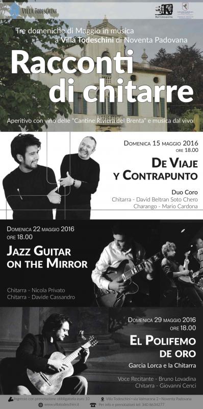 Infine “El Polifemo de Oro”: la voce recitante di Bruno Lovadina e la musica di Giovanni Cenci guideranno in un viaggio che attraverserà le poesie di Federico Garcia Lorca ispirate alla chitarra, accompagnate da musiche di autori coevi al poeta ma anche moderne composizioni a lui dedicate (29 maggio).