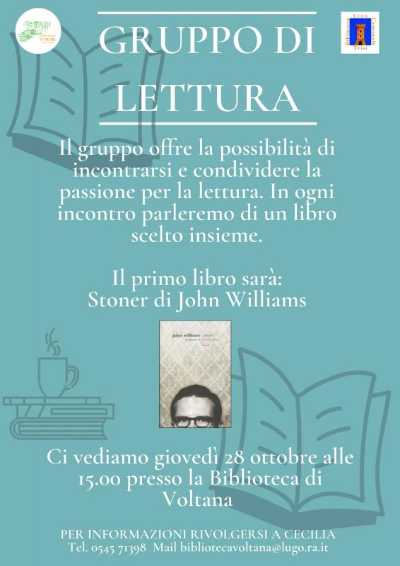 Giovedì 28 ottobre alle ore 15.00 si terrà presso la biblioteca di Voltana il primo incontro del Gruppo di Lettura, iniziativa volta ad offrire la possibilità agli utenti di incontrarsi e condividere la passione per la lettura. La nuova serie di incontri si aprirà con il libro di John Williams, "Stoner".