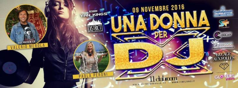 Mercoledì 9 Novembre 2016 dalle 23:30 all’11clubroom di Milano (Via Tocqueville, 11) prende vita “Una Donna per DJ e Vocalist”, show contest ideato e condotto dal celebre Valerio Merola (http:// valeriomerola.com). E’ l’official release party dell’evento. Il format, che è anche un party ma non solo, si propone di valorizzare e promuovere la professione delle donne come DJ, Producer e Vocalist. Collabora con questa iniziativa come Dj Coach Paola Peroni, che è prima di tutto una delle DJ italiane più conosciute e stimate. All'evento parteciperanno DJ e Vocalist e diverse Special Guest Star. Dj resident è invece Yan Kings Priv. “Una Donna per DJ e Vocalist” è insomma un tour itinerante alla ricerca di una dj e una vocalist che avranno la possibilità di entrare a far parte dello staff di Radio Studio Più, la Dance Station che è partner dell’evento. L’evento è organizzato GLovers Events ed in giuria spesso ha ospitato professionisti dello spettacolo della musica ed esponenti dell'imprenditoria Made in Italy. Chi vuol partecipare invii la propria candidatura può farlo a unadonnaperdj@gmail.com oppure via Facebook www.facebook.com/unadonnaperdj