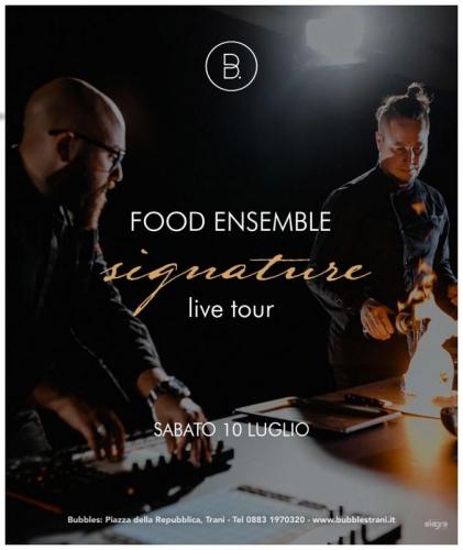 A tre anni dal lancio di Spaghetti Symphony, realizzato per Barilla con Davide Oldani, Signature è il nuovo album dei Food Ensemble, da cui trae origine anche il nome del tour nei più bei locali d’Italia, pronto ad essere “degustato live" anche nello scenario incantato del giardino del Bubbles di Trani (BT) a partire dalle ore 20,30.