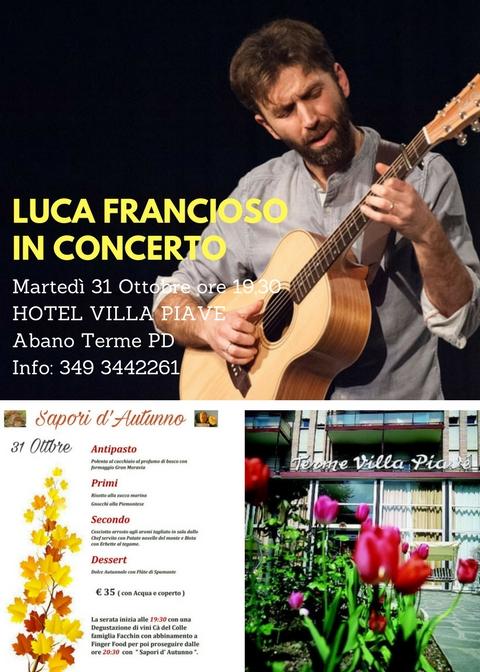 Vini tipici del territorio e prelibatezze stagionali all'Hotel Villa Piave Viale Delle Terme 60 Abano Terme (Padova), dimora di Vittorio Emanuele III e centro culturale e artistico della cittadina, in occasione dell'evento "Sapori d'autunno".Oltre alla degustazione di vini scelti e alla cena con prodotti di stagione, ci sarà anche la presentazione del nuovo CD "Bausatz" del musicista Luca Francioso, tra i più quotati chitarristi fingestyle italiani con oltre mille concerti in Italia e all'estero.