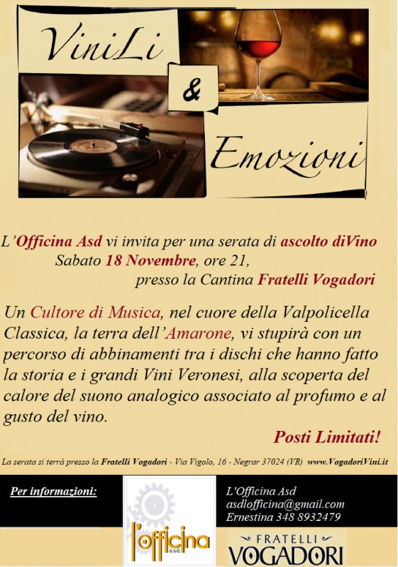 L’Officina Asd vi invita ad una serata di ascolto diVino Sabato 18 Novembre presso la Cantina Fratelli Vogadori di Negrar.La regia della serata è nelle mani di Paolo Montresor già dj nelle prime radio libere e nelle discoteche alla fine degli anni 70. Nel tempo non ha mai perso la passione per la buona musica e per l’ascolto di qualità e negli ultimi anni ha ripreso in mano i suoi vecchi vinili riscoprendo le storie che stanno dietro ad ogni brano, creando così dei percorsi di cultura musicale ma soprattutto di condivisione delle emozioni che solo l’ascolto analogico può scatenare.