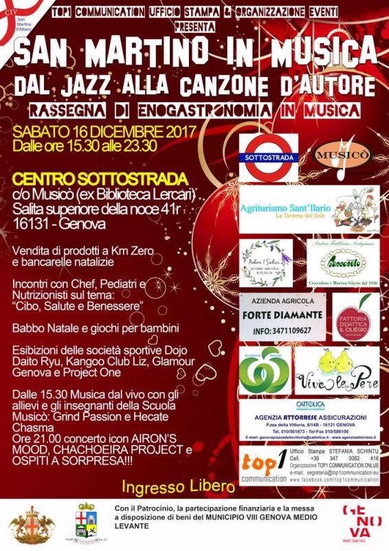 Sabato 16 dicembre 2017, a Genova presso il Centro Polivalente Sottostrada (Salita superiore della noce 41r, ex Biblioteca Lercari, dalle ore 15.30, ingresso libero) si svolgerà la prima edizione di SAN MARTINO IN MUSICA, DAL JAZZ ALLA CANZONE D’AUTORE – RASSEGNA DI MUSICA ED ENOGASTRONOMIA con il Patrocinio, la partecipazione finanziaria e la messa a disposizione di beni del MUNICIPIO VIII GENOVA MEDIO LEVANTE. L’evento è organizzato dalla Associazione Culturale Top1 Communication in collaborazione con Musicò e con il Patrocinio del CIV San Martino d’Albaro.