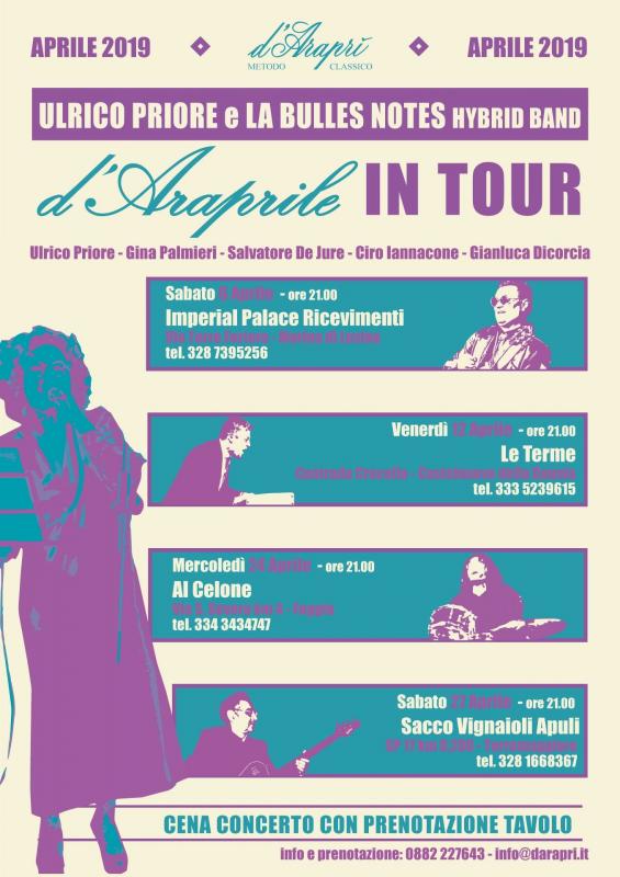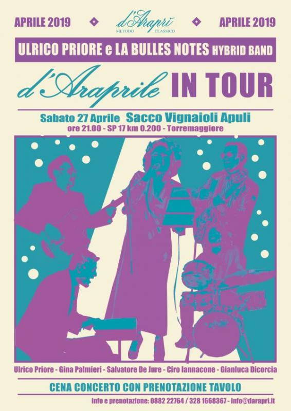 Sabato 27 aprile quarta ed ultima tappa della rassegna d'Araprile in Tour 2019 con la formula Cena Concerto.