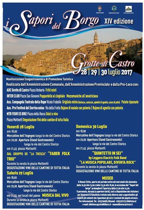 Mercatini artigianali,Visita al bellissimo Museo Civita, Musica e Divertimento faranno da cornice a queste tre splendide serate in cui 5 Associazioni paesane (Adc Grotte di Castro, Compagnia della Rupe, Festival del Sorriso, Inter Club, Mtb Four Es Bike) si cimenteranno nella preparazione dei piatti tipici, accogliendo i visitatori nelle proprie location, accuratamente abbellite.