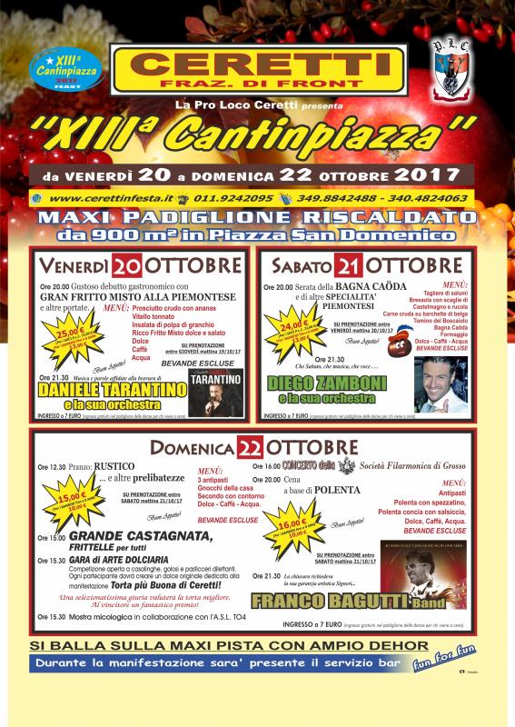 E’ iniziato il conto alla rovescia per la festa di Ceretti di Front. La piccola frazione è pronta a tornare protagonista e ad accogliere migliaia di visitatori. Una magia che si ripete ormai d anni, grazie ad un’organizzazione impeccabile, al lavoro e alla passione dei tanti volontari e del direttivo dell’Associazione Turistica Pro Loco Ceretti che sanno, edizione dopo edizione, proporre iniziative, spettacoli, ottimo cibo, tanta musica, stand espositivi dove curiosare in un mix fatto di tradizione e simpatiche novità. ll 20,21,22, Ottobre torna l'13° edizione di Cantinpiazza 2017.