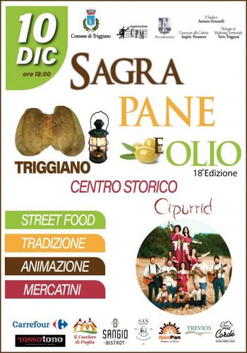 Giunge alla 18a edizione la Sagra di Triggiano (BA) del “Pane e Olio” che si svolgerà il 10 Dicembre 2022, con il pane tipico cotto a legna come una volta accompagnato dall'olio e non solo! A fare da cornice il Centro Storico.