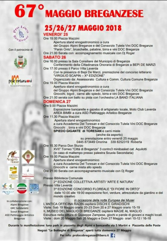 La Pro Loco di Breganze organizza il 67° Maggio Breganzese, conosciuto fino all'anno scorso come il Festival Del Vino di Breganze, da venerdì 25 a domenica 27 maggio 2018.