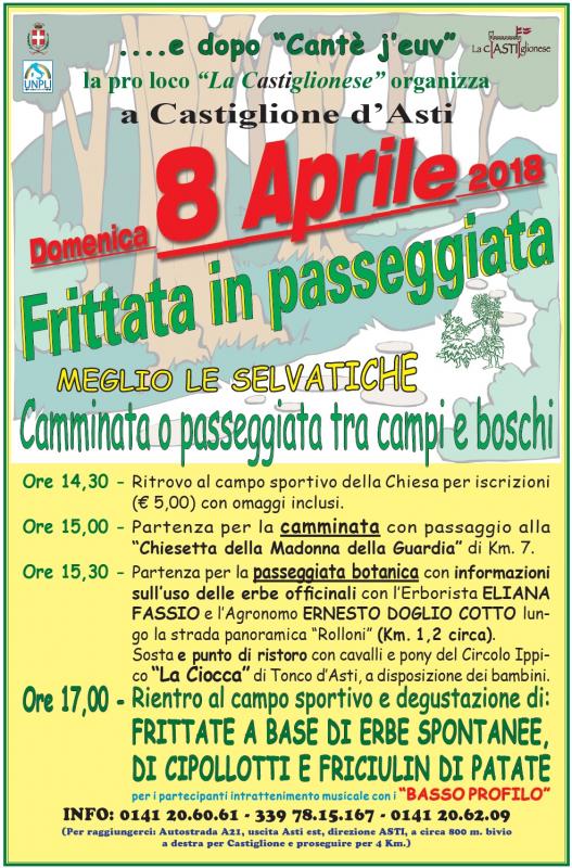Passeggiate primaverili in collina, tra profumi, sapori, musica e folklore. Ogni anno, dopo il consueto “Cantè J’euv” la Pro loco con le uova raccolte cucina e distribuisce frittate di vari gusti, tra cui frittate verdi realizzate con circa una ventina di erbe e fiori, raccolti nei prati e nei terreni incolti di Castiglione.