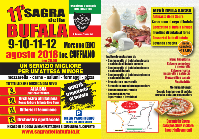 Si potranno degustare vari prodotti esclusivamente di bufala: mozzarella, caciocavallo, carne, salsiccia, dolci, ecc.