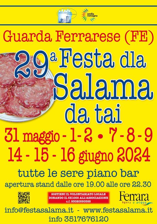 La Festa dla Salama da Tai si svolgea Guarda Ferrarese, (FE), nei giorni 31 maggio e 1 , 2 - 7, 8,l 9 - 14, 15, 16 Giugno 2024