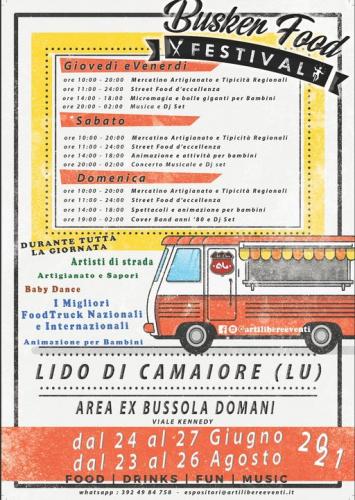 L’evento estivo Busker Food Festival vedrà protagonista Lido Di Camaiore (LU) nell'area ex Bussola Domani: 2 fine settimana, a giugno dal 24 al 27 a ad Agosto dal 23 al 26, durante i quali il parco cittadino si animerà all’insegna del divertimento, della musica, dell'artigianato e dello street food di qualità.