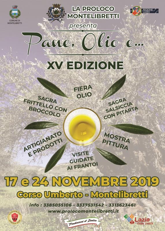 Il 17 ed il 24 Novembre 2019 il paese di Montelibretti non offrirà solo una gustosa carrellata di piatti tipici locali, esaltati dal sapore e dal profumo dell’olio extravergine di oliva, ma un vero e proprio viaggio in un universo tutto da scoprire che prevede anche visite ai frantoi. Qui sarà spiegato il processo di lavorazione dell'oliva e dell’imbottigliamento dell’olio, e si vivrà l’esperienza unica della degustazione dell’olio nuovo sulle bruschette; non mancheranno dimostrazioni sulla lavorazione del pane con assaggi di prodotti da forno cucinati al momento.