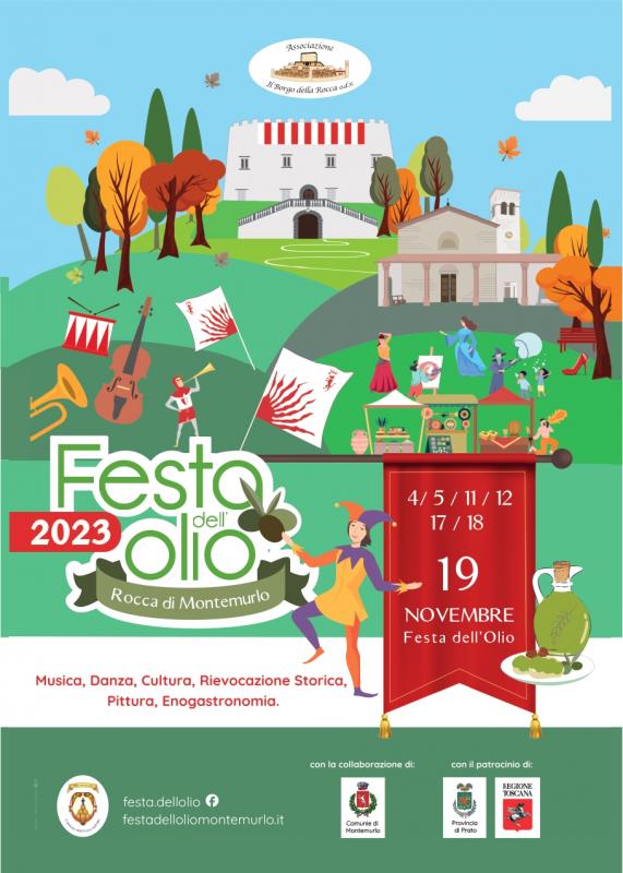 DALLE 7-00 Colazione alla "Taverna della Rocca" (cornetti caldi e quant'altro). Apertura del frantoio della Az. Agricola Felice Agricoltura e vendita di prodotti del territorio ore 9:00 Camminolio contro la violenza sulle donne a cura della Camminotte e della Commissione Pari Opportunità del Comune di Montemurlo. Stand delle Associazioni, Mercatino dell'Artigianato e opere dell'ingegno ore 9:30 Esposizione dell'olio prodotto in Montemurlo Stand della Associazione Filiera Corta APS di Montemurlo ore 10:00 "A SPASSO NEL BORGO": visita accompagnata alla Pieve e apertura straordinaria del Giardino e delle cantine del Castello. Scenografie rinascimentali a cura del Gruppo Storico di Montemurlo Dalle 10:00 Prova gratuita di mini-moto da cross e mini-quad elettrici a cura di MOTORTERAPY a cura di PratoAiutaPrato. ore 11:00 In piazza: apertura degli stand tradizionali della Festa dell'olio (fettunta, minestra di pane, tortelli, salsicce e fagioli, vino novello, frugiate, dolci vari), il chiosco del porchettaio, lampredottaio e trippaio. Ore 11:00 Concerto di S. Cecilia nella Pieve a cura della Filarmonica G. Verdi di Montemurlo Ore 12:00 Danze storiche a cura del Gruppo Storico di Montemurlo Dalle 12:30 Pranzo tipico contadino presso la Canonica di Rocca con il "MENU DEL FRANTOIANO" Dalle 12:30 Pranzo al ristorante La Taverna della Rocca, solo su prenotazione, 3289857707 Dalle 14:00 Intrattenimento con i canti popolari e gli stornelli de "I Maggiaioli di Bagnolo" Spettacolo di giocolieri itineranti nel borgo con D'Artagnan il Mago delle Bolle Animazione a cura dell'Ass. Biribà APS Ore 15:00 Sfilata storica e spettacolo di bandiere a cura del Gruppo Storico di Montemurlo. Ore 16:30 Giocolieri e mangiatori di Fuoco Ore 17:00 Concerto del Coro Gospel Black & White Ensemble nella Pieve Ore 18:00 Ringraziamenti delle autorità