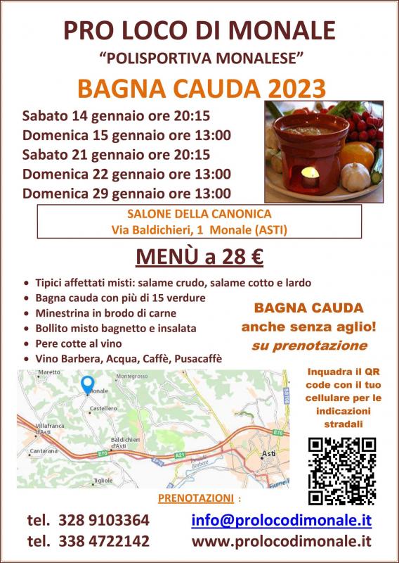 Come ogni anno con l'inverno ritorna la Bagna Cauda della Pro Loco di Monale che quest'anno si potrà gustare nei giorni: Sabato 14 Gennaio (ore 20.15), Domenica 15 Gennaio (ore 13.00), Sabato 21 Gennaio (ore 20.15), Domenica 22 Gennaio (ore 13.00), Domenica 29 Gennaio (ore 13.00).