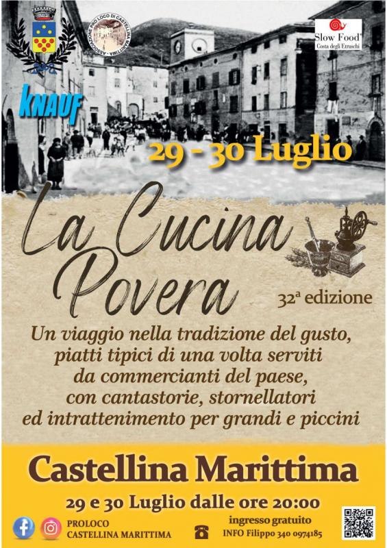 La Cucina Povera è una manifestazione a sfondo enogastronomico organizzata e gestita dalla Pro-Loco di Castellina Marittima in stretta collaborazione con l’Amministrazione Comunale e con la partecipazione di Slow Food Costa degli Etruschi e di tutte le associazioni, commercianti e aziende del territorio.